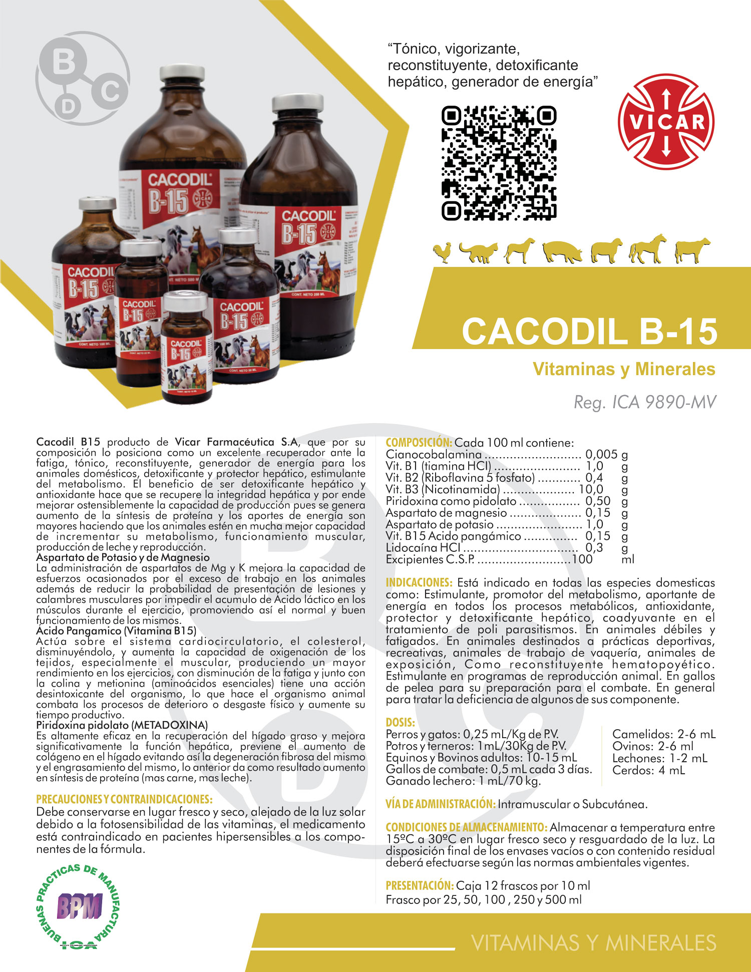 Cacodil B15 producto de Vicar Farmacéutica S.A, que por su composición lo posiciona como un excelente recuperador ante la fatiga, tónico, reconstituyente, generador de energía para los animales domésticos, detoxificante y protector hepático, estimulante del metabolismo. El beneficio de ser detoxificante hepático y antioxidante hace que se recupere la integridad hepática y por ende mejorar ostensiblemente la capacidad de producción pues se genera aumento de la síntesis de proteína y los aportes de energía son mayores haciendo que los animales estén en mucha mejor capacidad de incrementar su metabolismo, funcionamiento muscular, producción de leche y reproducción.
