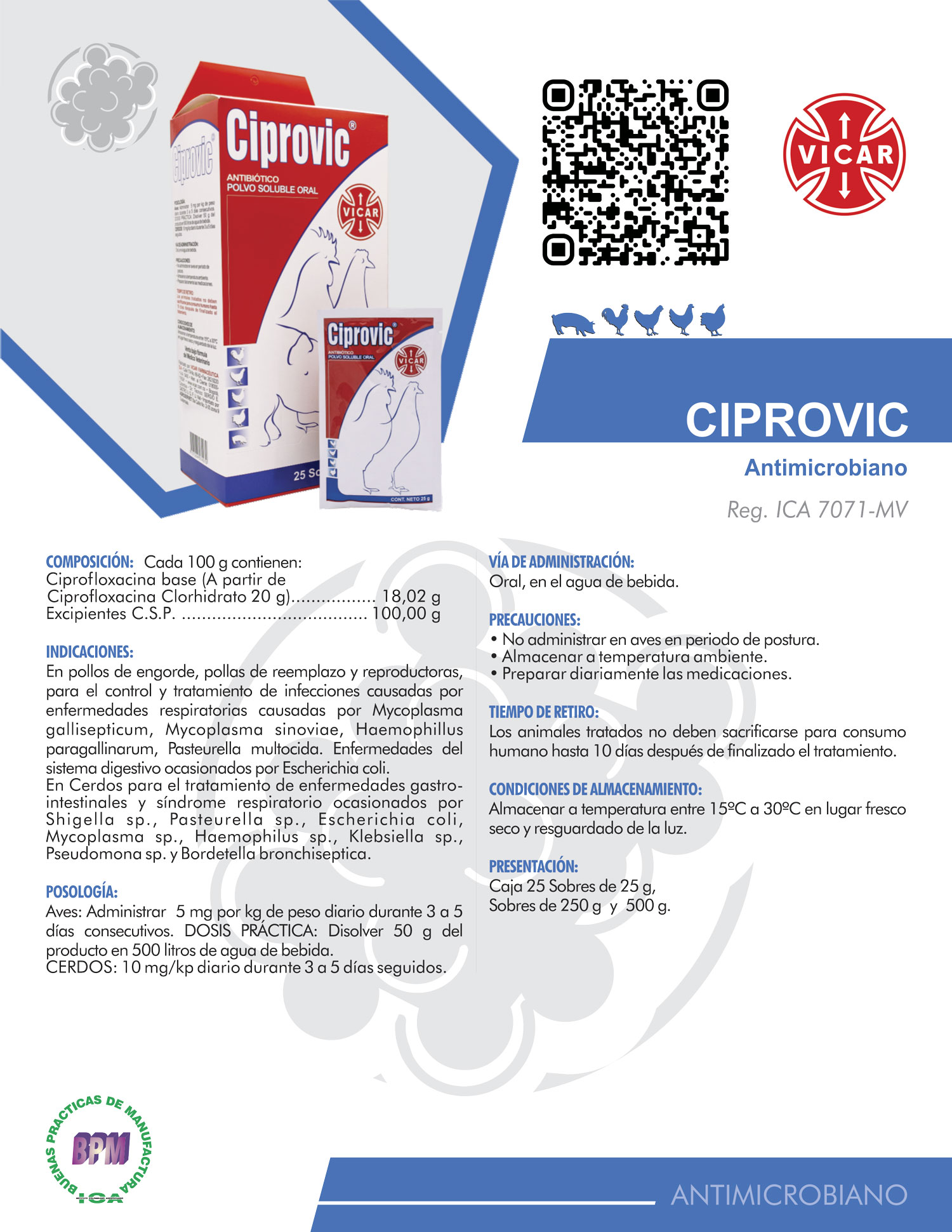 AVES: Administrar 5 mg por kg de peso diario durante 3 a 5 días consecutivos. DOSIS PRÁCTICA: Disolver 50 g del producto en 500 litros de agua de bebida.