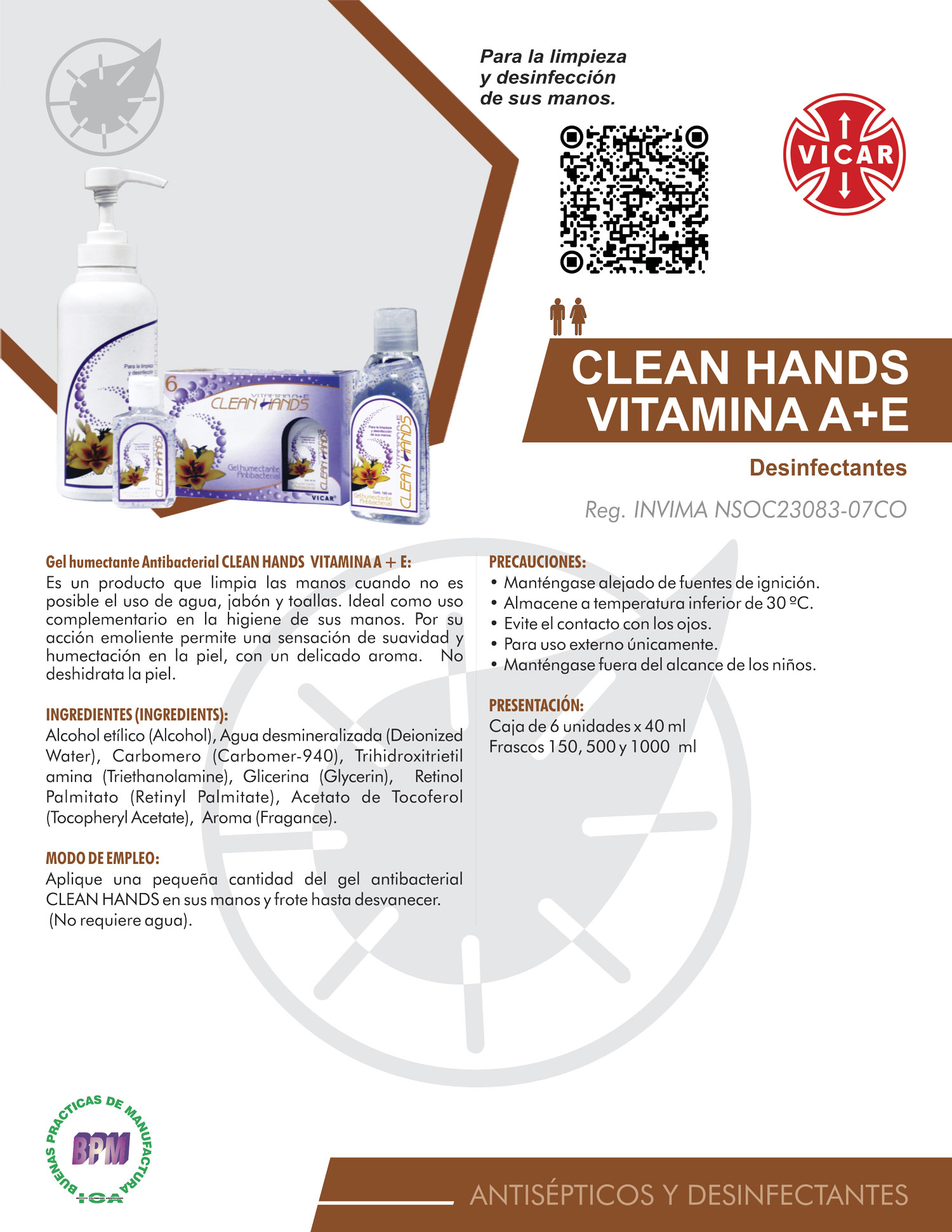 Gel humectante Antibacterial CLEAN HANDS VITAMINA A + E: