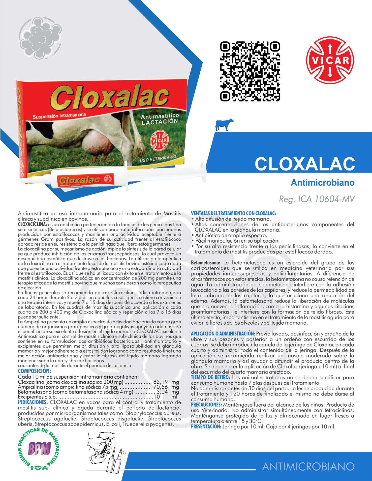 La Ampicilina presenta un amplio espectro de actividad bactericida contra gran número de organismos gran-positivos y gran-negativos apoyado además con el beneficio de su excelente difusión en el tejido mamario.CLOXALAC excelente Antimastitico para el control de mastitis clínica y sub-clínica de los bovinos que contiene en su formulación dos antibióticos bactericidas , antinflamatorio y excipientes que permiten mejor difusión y alta liposolubilidad en glándula mamaria y mejor adherencia a estos tejidos logrando como resultado final una mejor acción antibacteriana y evitar la fibrosis del tejido mamario logrando mantener sana la ubre y libre de bacterias.