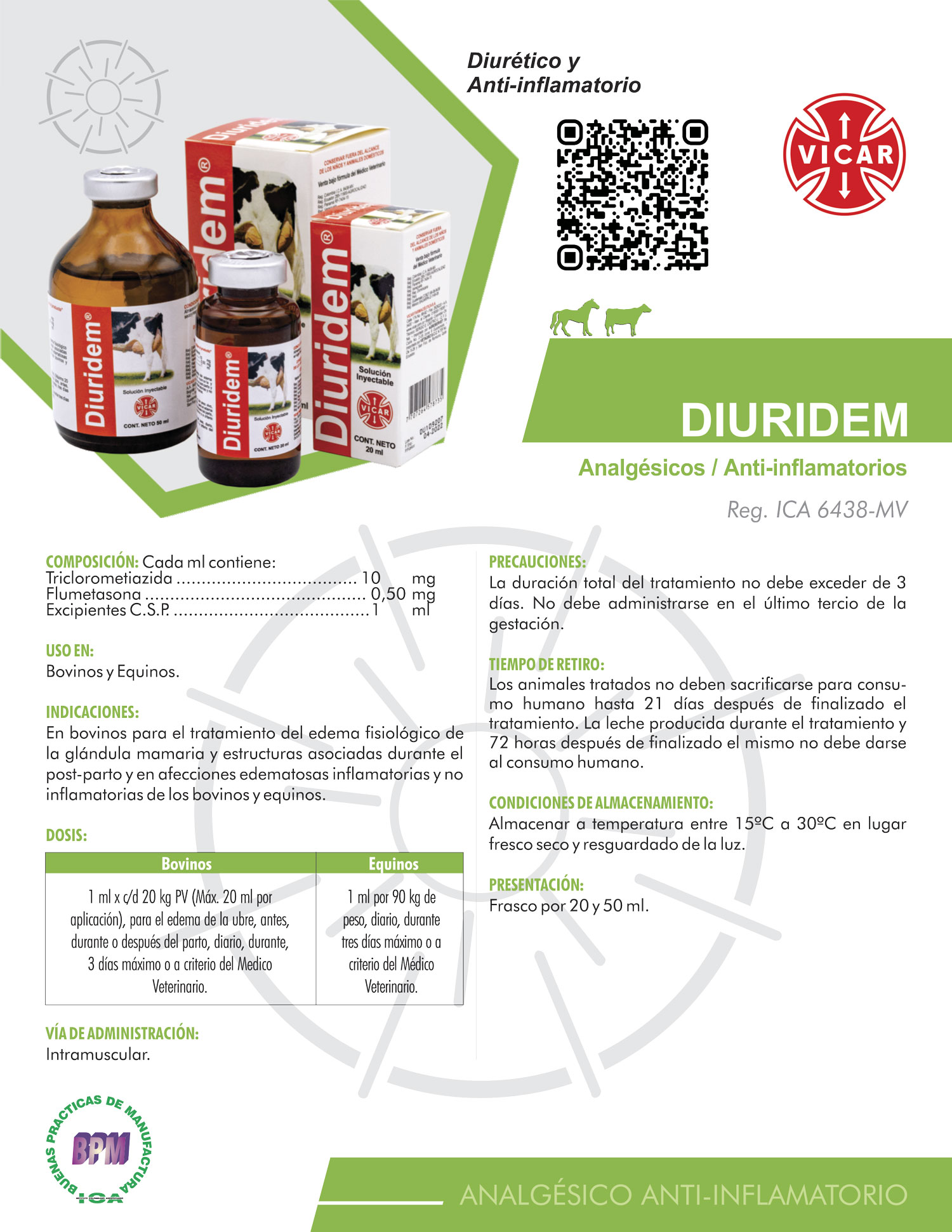 En bovinos para el tratamiento del edema fisiológico de la glándula mamaria y estructuras asociadas durante el post-parto y en afecciones edematosas inflamatorias y no inflamatorias de los bovinos y equinos.