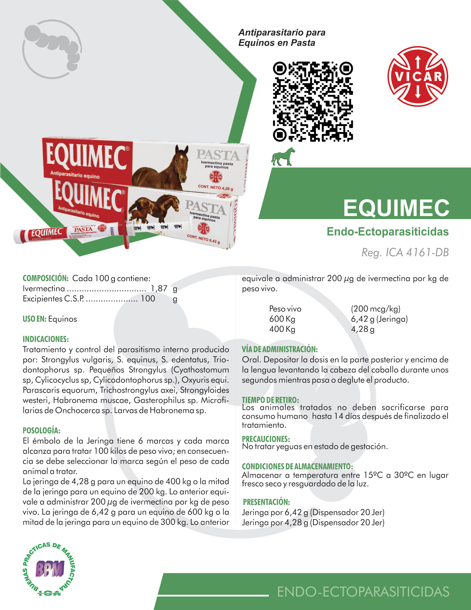 La jeringa de 4,28 g para un equino de 400 kg o la mitad de la jeringa para un equino de 200 kg. Lo anterior equivale a administrar 200 µg de ivermectina por kg de peso vivo. La jeringa de 6,42 g para un equino de 600 kg o la mitad de la jeringa para un equino de 300 kg. Lo anterior equivale a administrar 200 µg de ivermectina por kg de peso vivo.