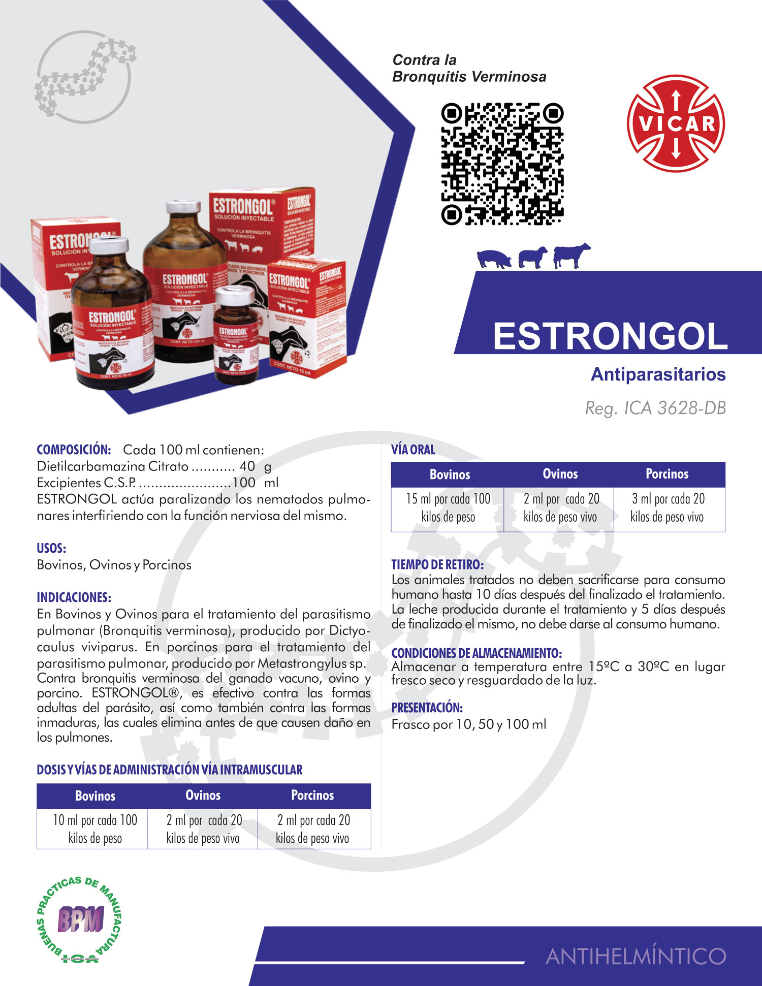 Contra bronquitis verminosa del ganado vacuno, ovino y porcino. ESTRONGOL®, es efectivo contra las formas adultas del parásito, así como también contra las formas inmaduras, las cuales elimina antes de que causen daño en los pulmones.