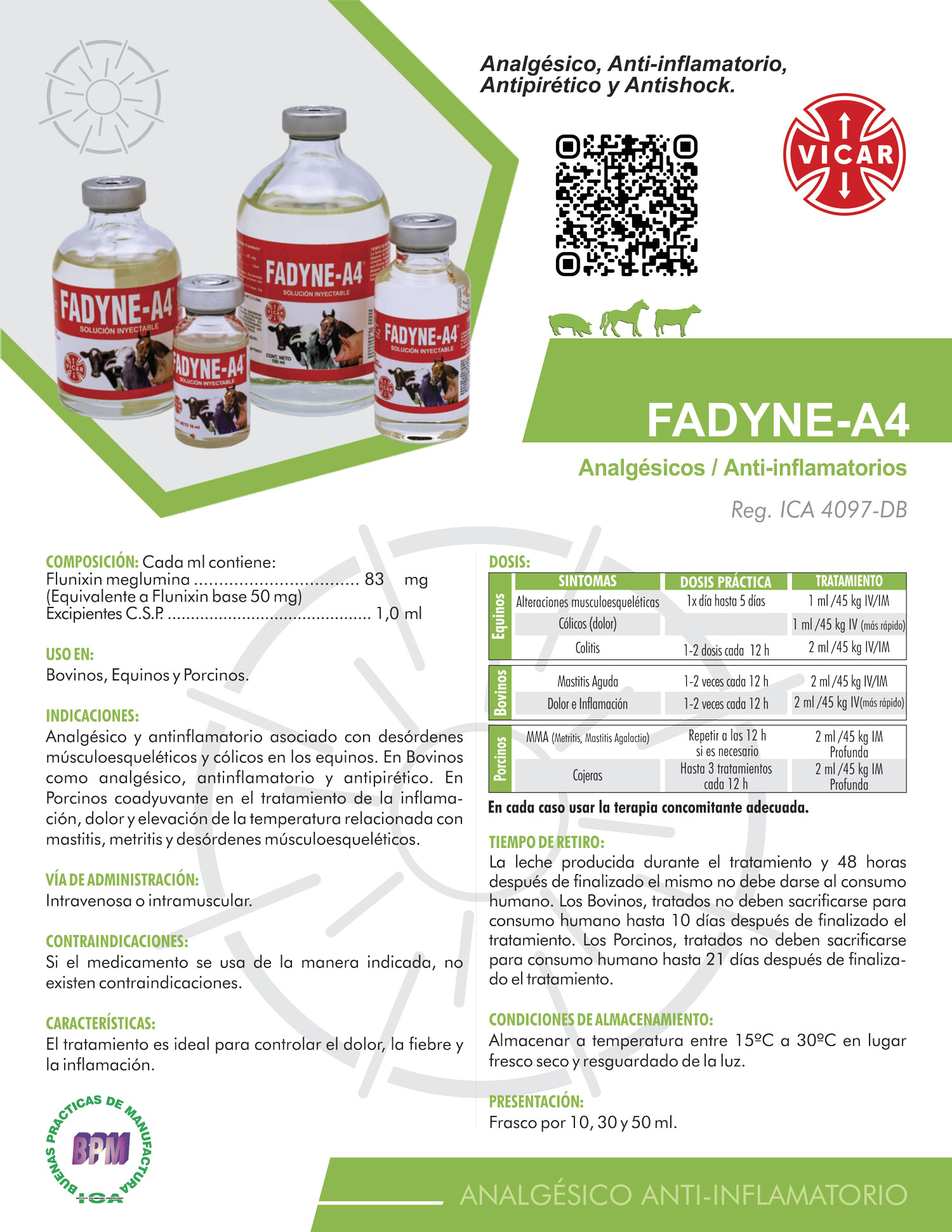 Analgésico y antinflamatorio asociado con desórdenes musculoesqueléticos y cólicos en los equinos. En Bovinos como analgésico, antinflamatorio y antipirético. En Porcinos coadyuvante en el tratamiento de la inflamación, dolor y elevación de la temperatura relacionada con mastitis, metritis y desórdenes musculoesqueléticos.