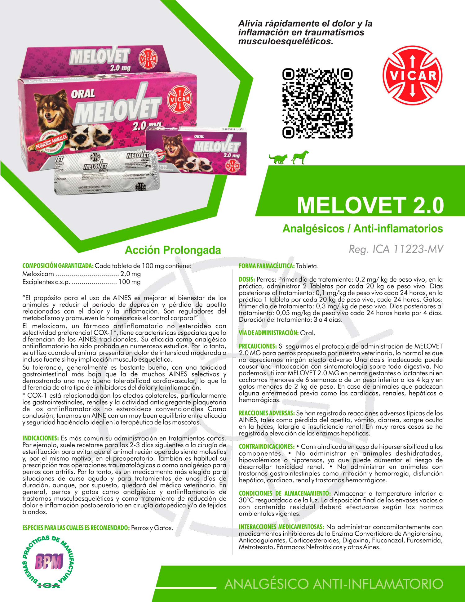 El meloxicam, un fármaco antiinflamatorio no esteroideo con selectividad preferencial COX-1*, tiene características especiales que lo diferencian de los AINES tradicionales. Su eficacia como analgésico antiinflamatorio ha sido probada en numerosos estudios. Por lo tanto, se utiliza cuando el animal presenta un dolor de intensidad moderada o incluso fuerte si hay implicación musculo esquelética.
