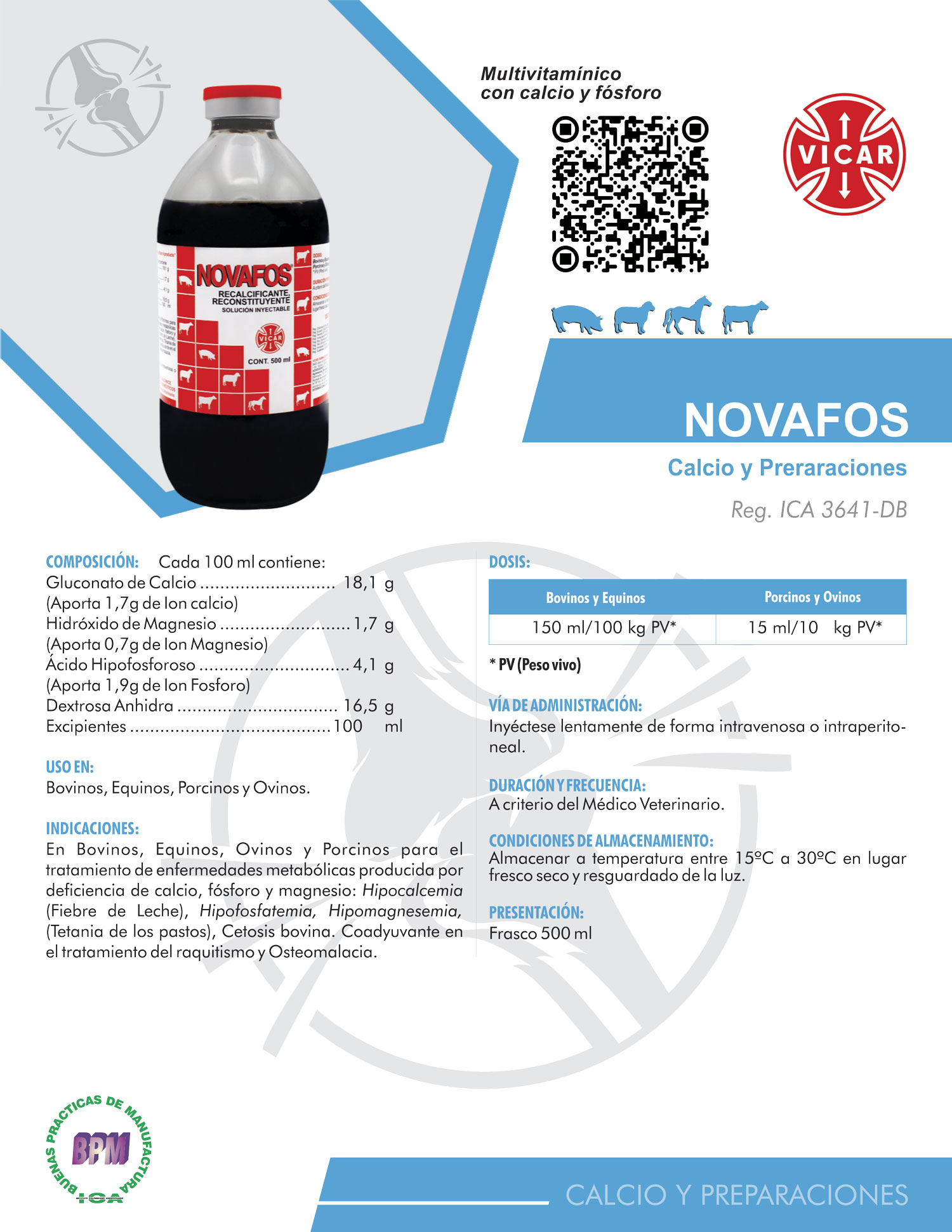 En Bovinos, Equinos, Ovinos y Porcinos para el tratamiento de enfermedades metabólicas producida por deficiencia de calcio, fósforo y magnesio: Hipocalcemia (Fiebre de Leche), Hipofosfatemia, Hipomagnesemia, (Tetania de los pastos), Cetosis bovina. Coadyuvante en el tratamiento del raquitismo y Osteomalacia.