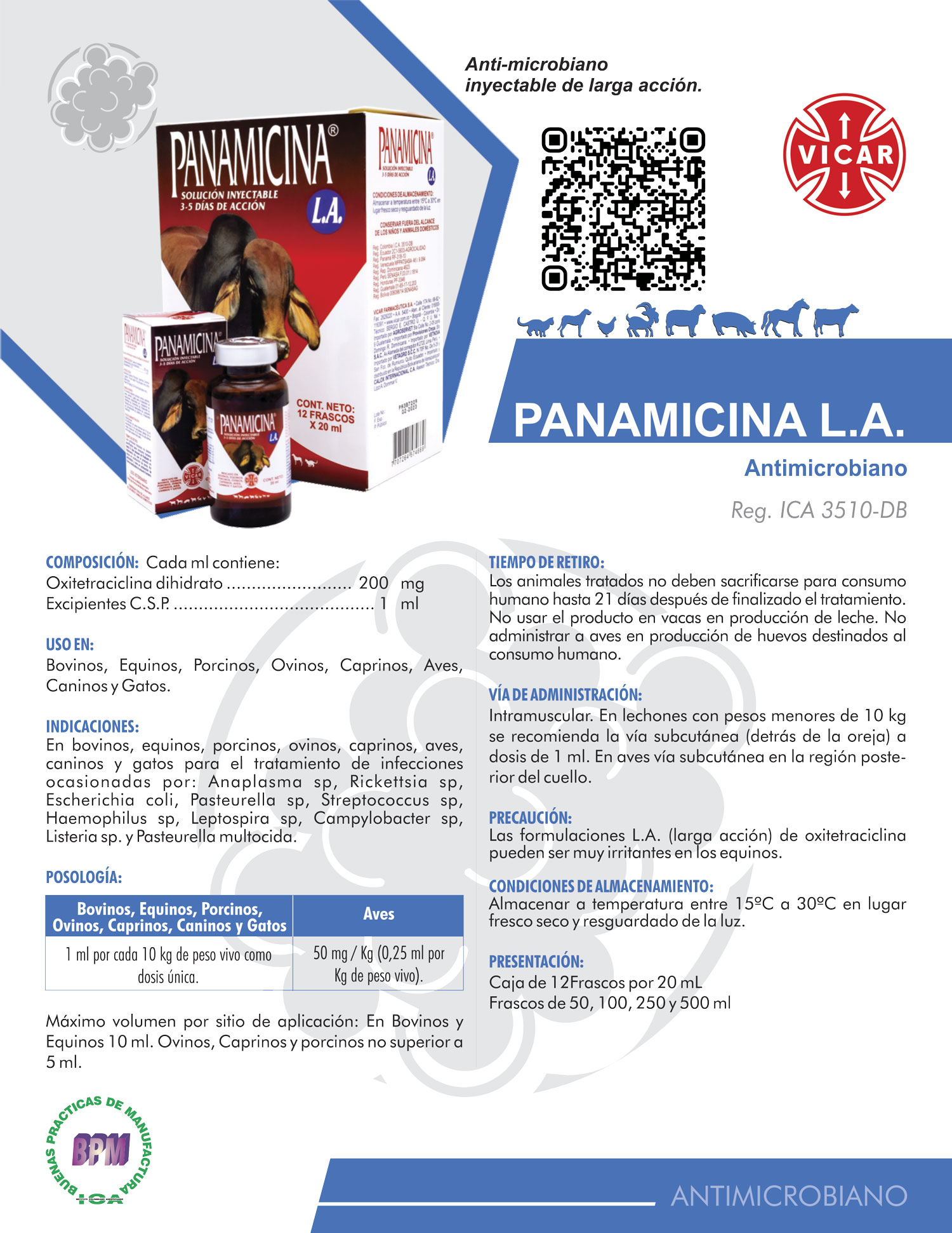 En bovinos, equinos, porcinos, ovinos, caprinos, aves, caninos y gatos para el tratamiento de infecciones ocasionadas por: Anaplasma sp, Rickettsia sp, Escherichia coli, Pasteurella sp, Streptococcus sp, Haemophilus sp, Leptospira sp, Campylobacter sp, Listeria sp. y Pasteurella multocida.