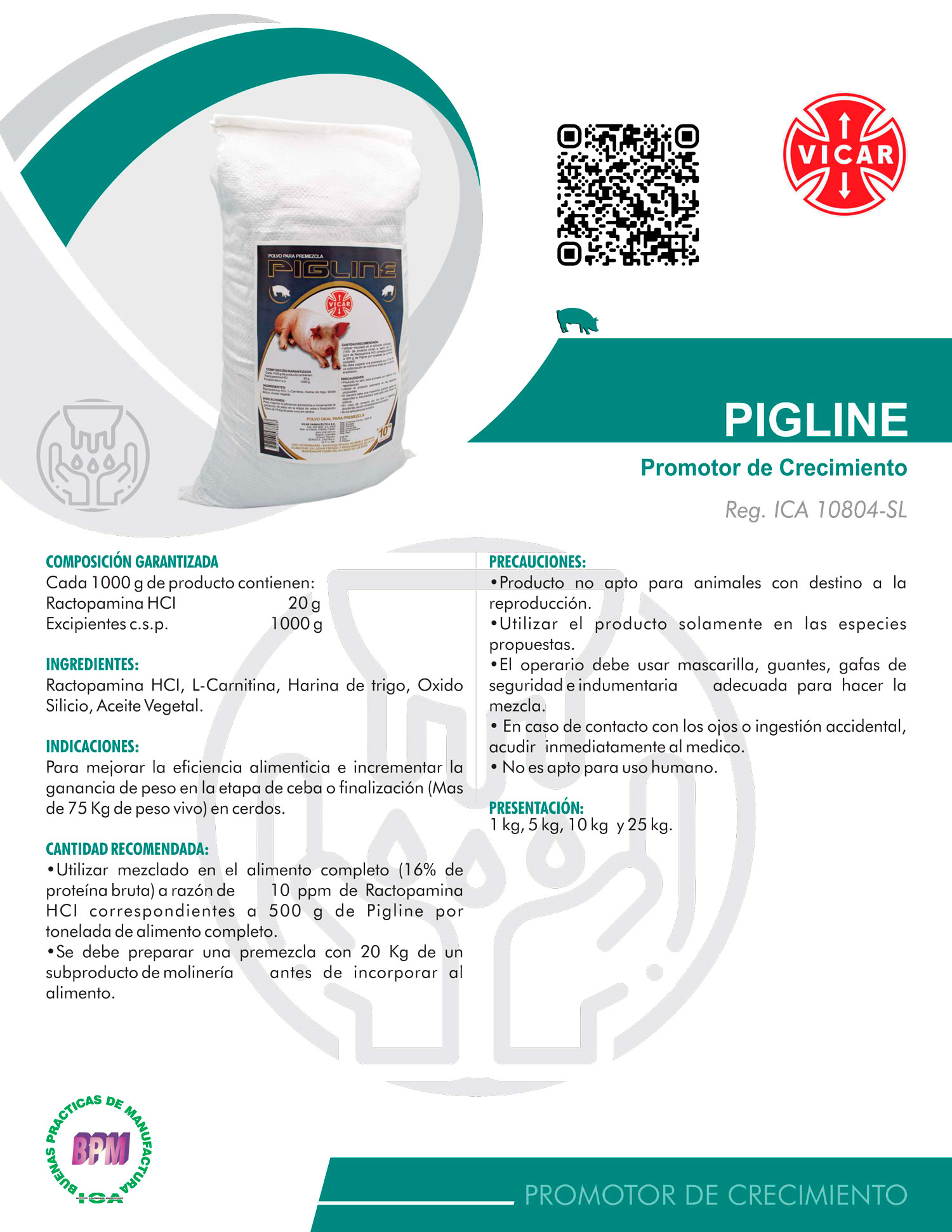 - Utilizar mezclado en el alimento completo (16% de proteína bruta) a razón de 10 ppm de Ractopamina HCI correspondientes a 500 g de Pigline por tonelada de alimento completo.
