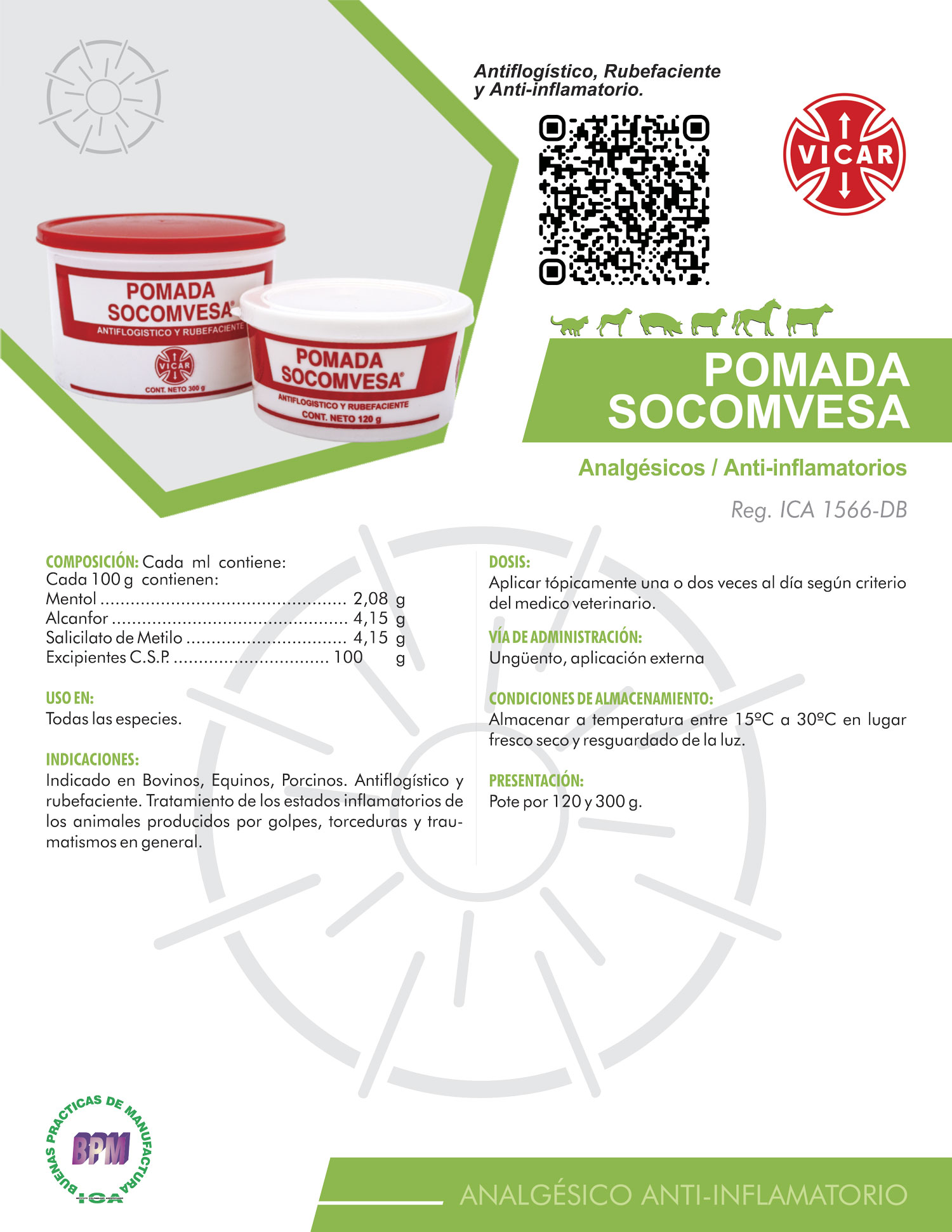 Indicado en Bovinos, Equinos, Porcinos. Antiflogístico y rubefaciente. Tratamiento de los estados inflamatorios de los animales producidos por golpes, torceduras y traumatismos en general.
