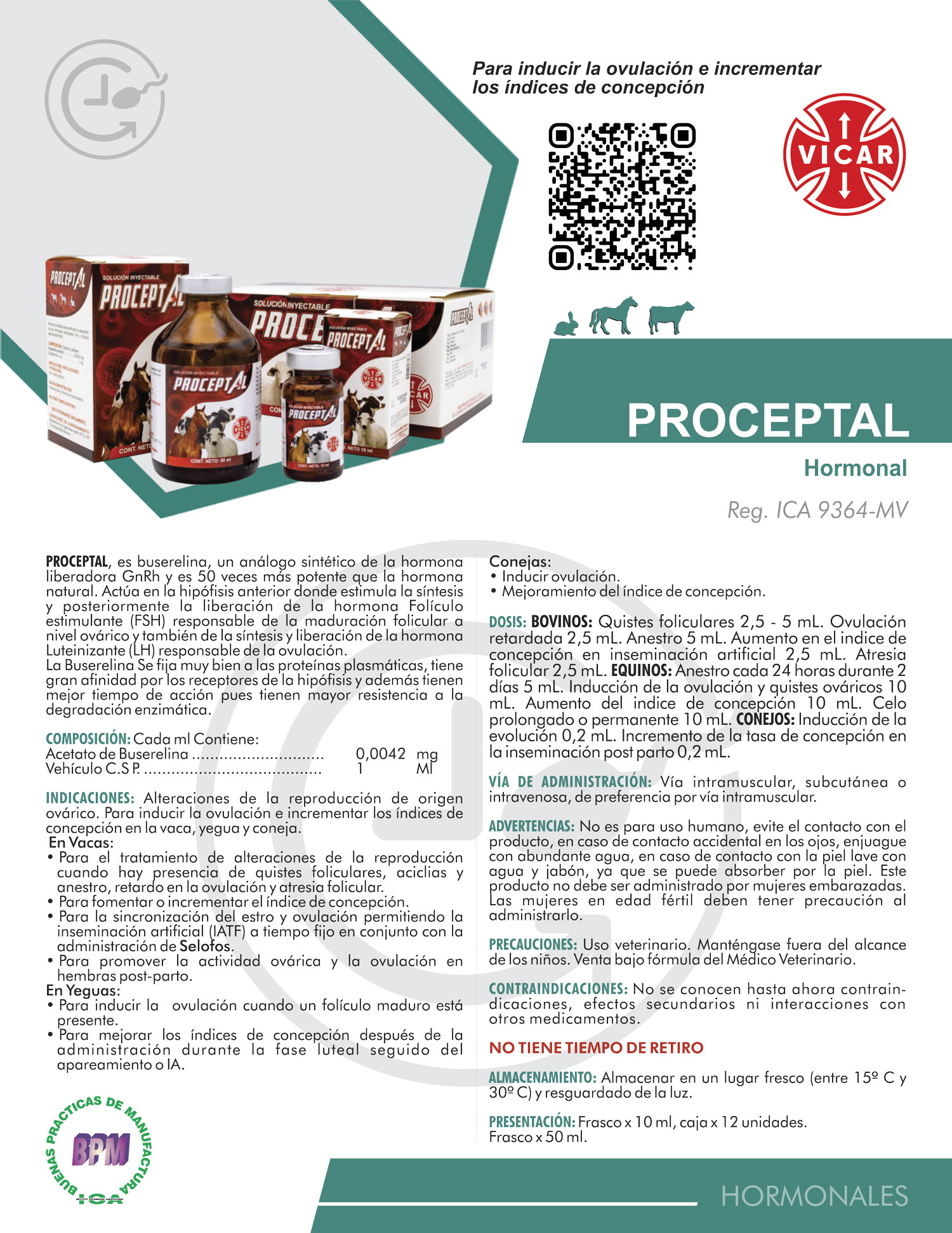INDICACIONES PROCEPTAL: Alteraciones de la reproducción de origen ovárico. Para inducir la ovulación e incrementar los índices de concepción en la vaca, yegua y coneja.
