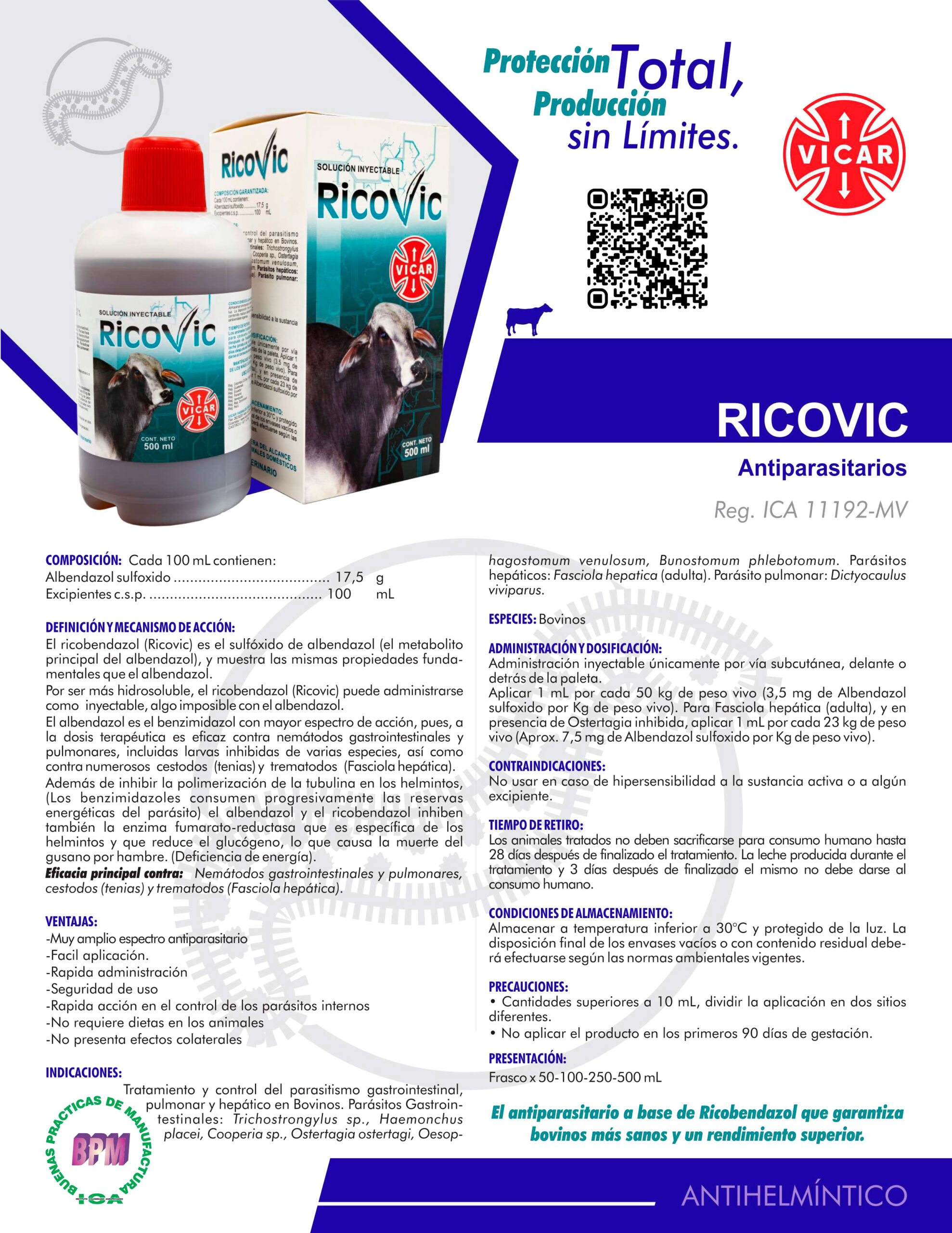 El ricobendazol (Ricovic) es el sulfóxido de albendazol (el metabolito principal del albendazol), y muestra las mismas propiedades fundamentales que el albendazol.