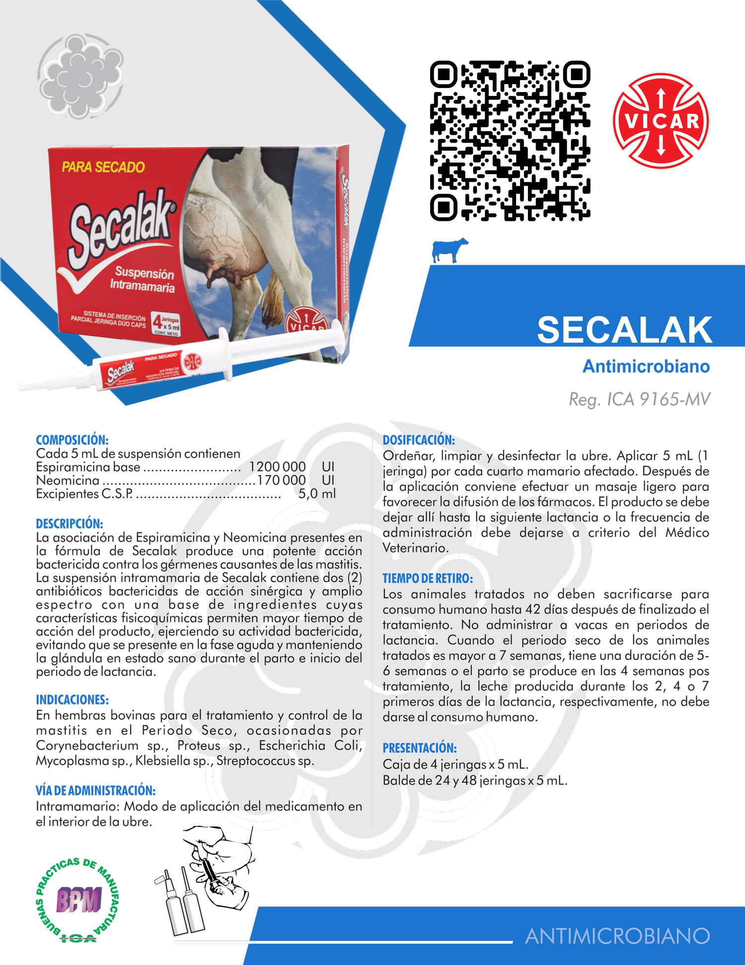La asociación de Espiramicina y Neomicina presentes en la fórmula de Secalak produce una potente acción bactericida contra los gérmenes causantes de las mastitis. La suspensión intramamaria de Secalak contiene dos (2) antibióticos bactericidas de acción sinérgica y amplio espectro con una base de ingredientes cuyas características fisicoquímicas permiten mayor tiempo de acción del producto, ejerciendo su actividad bactericida, evitando que se presente en la fase aguda y manteniendo la glándula en estado sano durante el parto e inicio del periodo de lactancia.