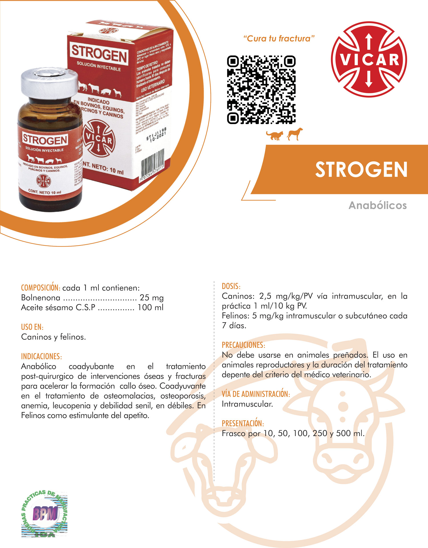En bovinos, equinos, porcinos y perros, anabólico coadyuvante en el tratamiento postquirúrgico de intervenciones óseas y fracturas para acelerar la formación de callo óseo. Coadyuvante en el tratamiento de osteomalacia, osteoporosis, anemia, leucopenia, inapetencia, pérdida de peso, debilidad senil.
