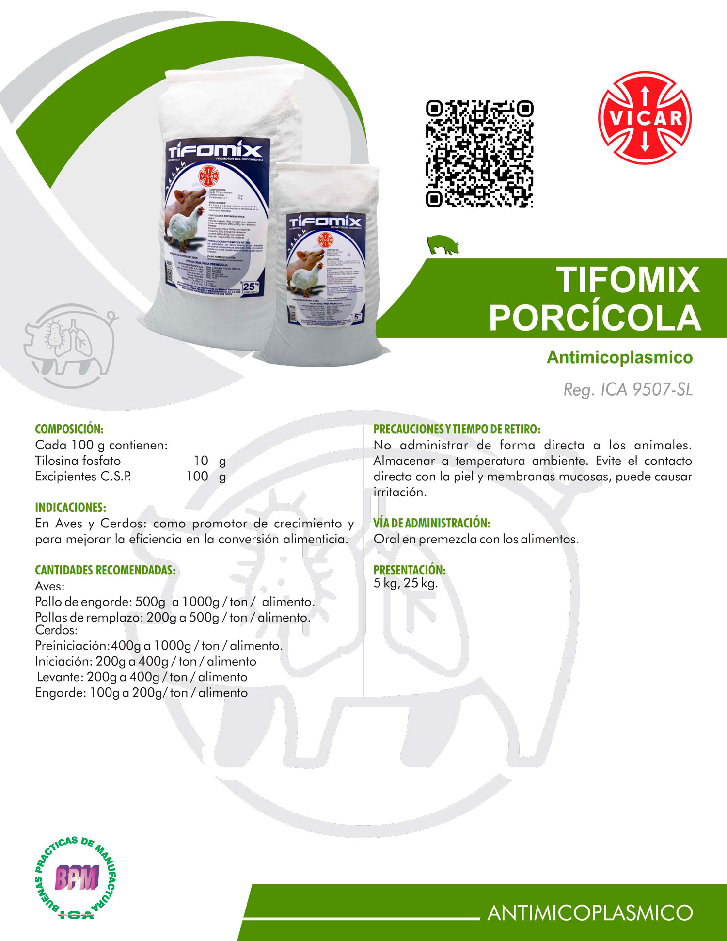 En Aves y Cerdos: como promotor de crecimiento y para mejorar la eficiencia en la conversión alimenticia.