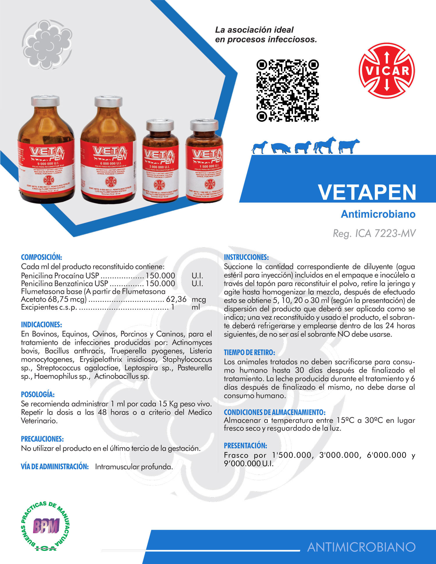 En Bovinos, Equinos, Ovinos, Porcinos y Caninos, para el tratamiento de infecciones producidas por: Actinomyces bovis, Bacillus anthracis, Trueperella pyogenes, Listeria monocytogenes, Erysipelothrix insidiosa, Staphylococcus sp., Streptococcus agalactiae, Leptospira sp., Pasteurella sp., Haemophilus sp., Actinobacillus sp.