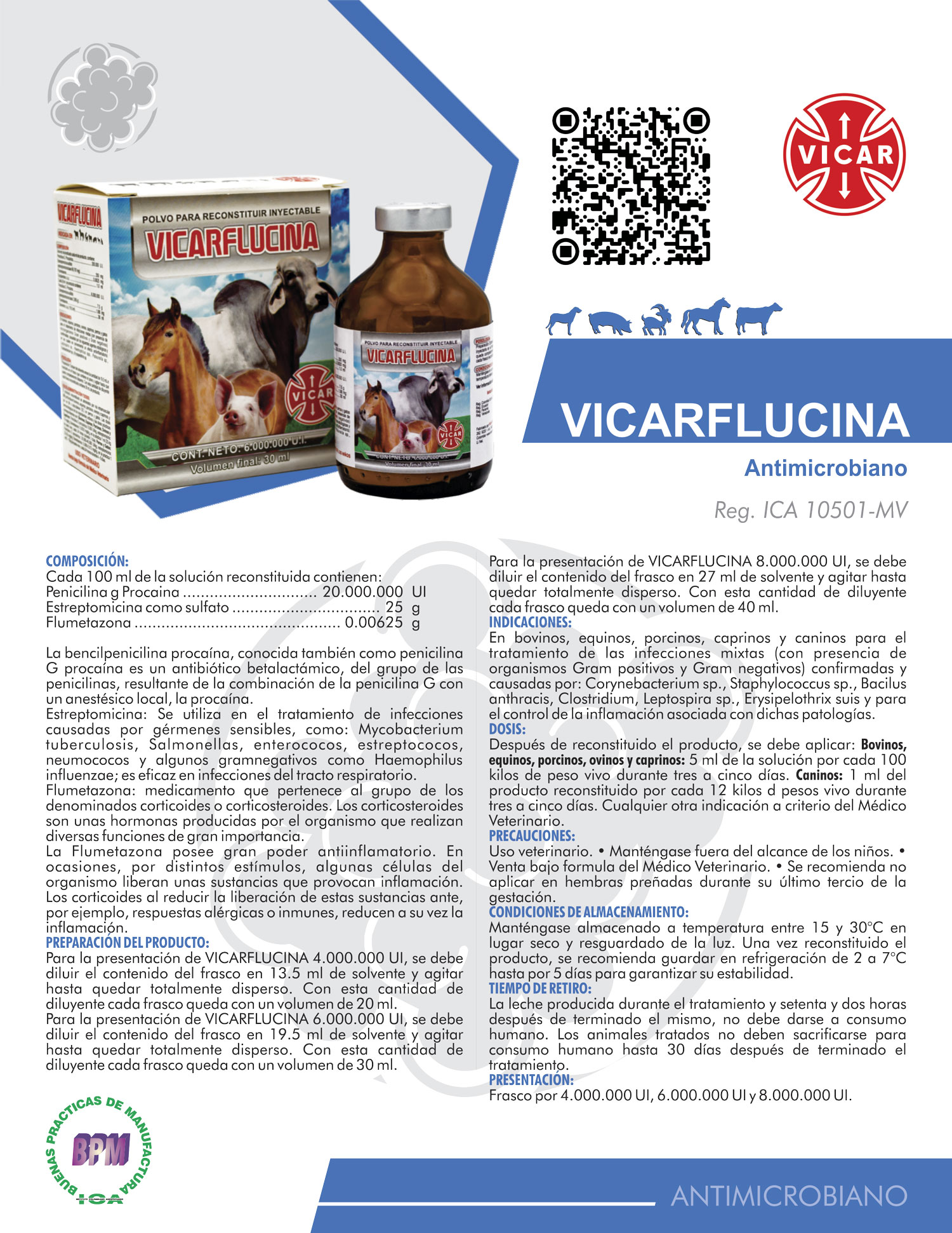 Para la presentación de VICARFLUCINA 6.000.000 UI, se debe diluir el contenido del frasco en 19.5 ml de solvente y agitar hasta quedar totalmente disperso. Con esta cantidad de diluyente cada frasco queda con un volumen de 30 ml.