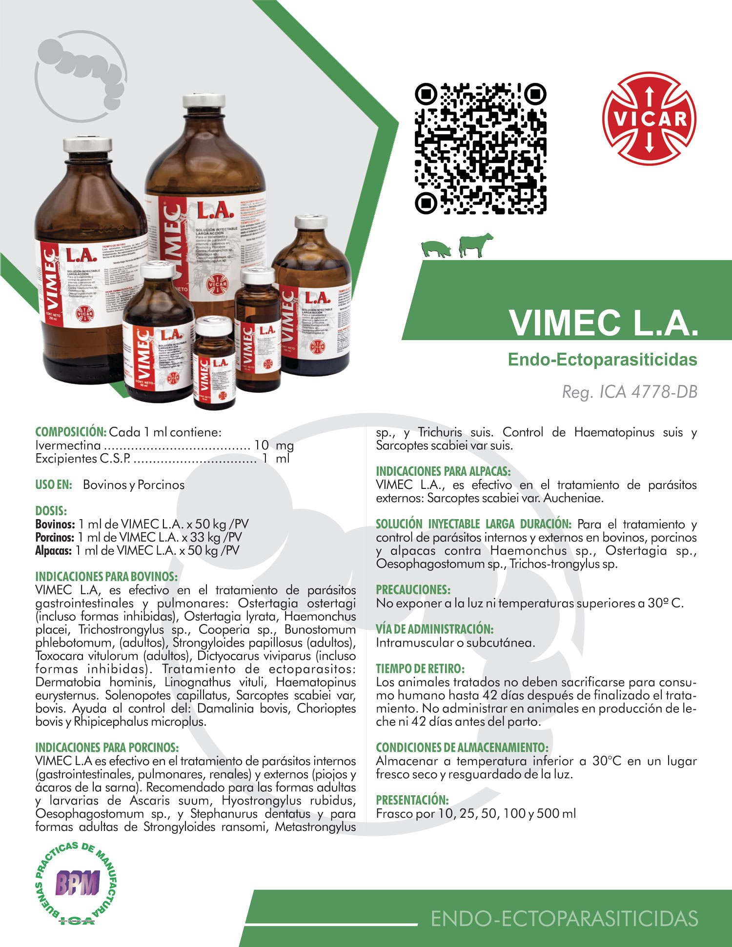 VIMEC L.A, es efectivo en el tratamiento de parásitos gastrointestinales y pulmonares: Ostertagia ostertagi (incluso formas inhibidas), Ostertagia lyrata, Haemonchus placei, Trichostrongylus sp., Cooperia sp., Bunostomum phlebotomum, (adultos), Strongyloides papillosus (adultos), Toxocara vitulorum (adultos), Dictyocarus viviparus (incluso formas inhibidas). Tratamiento de ectoparasitos: Dermatobia hominis, Linognathus vituli, Haematopinus eurysternus. Solenopotes capillatus, Sarcoptes scabiei var, bovis. Ayuda al control del: Damalinia bovis, Chorioptes bovis y Rhipicephalus microplus.